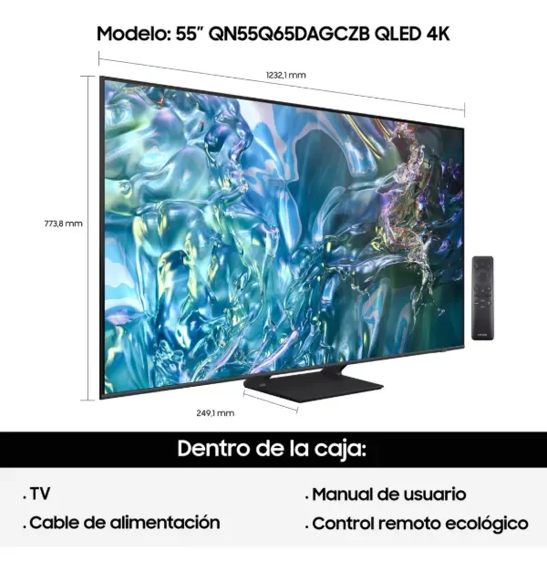 Este modelo QLED de 55 pulgadas utiliza la tecnología Quantum Dot, logrando un 100% de volumen de color. Su resolución 4K (3840x2160) es optimizada por el Procesador Quantum Lite 4K. Cuenta con Quantum HDR para mayor contraste, un diseño AirSlim ultra delgado y Modo Juego Automático (ALLM) para una mejor experiencia de gaming.